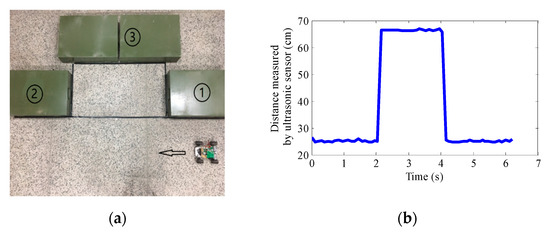 Ultrasonic sensor is a distance sensor based on the principle of ultrasonic reflection. The distance between the parked vehicles and the body of ego vehicle is small, so the advantages of ultrasonic sensors are fully exerted. The echo is formed by ultrasonic reflection when it touches obstacles. The transit time detection method is used to measure the distance by the parameter difference between the transmitting wave and the return wave. The intelligent minicar controlled by Arduino microcontroller is used as the experimental equipment. The simulated parking space with length of 1 m and width of 0.52 m is set up and a simulation experiment scene is built according to the parallel parking conditions. Objects ➀ and ➁ with certain volume and shape are used to simulate the parked vehicles 1 and 2, and object ➂ is used to represent the road boundary. The experimental scene is shown in Figure 9a. The motor speed is fixed by analogWrite function, and the analog of input pin is 40 (square wave with duty cycle of 40/255 is output by PWM) to make the speed in each experiment consistent.