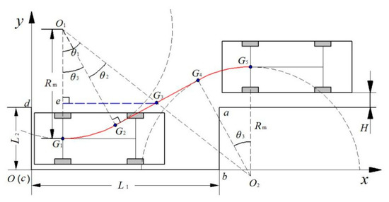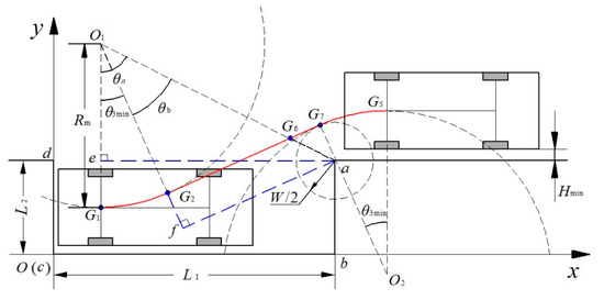The limit situation of vehicle collision free is analyzed in Figure 11. When the vehicle enters the straight line section, the distance between point a and the straight section is greater than half of the width of the body W, and the circle centered on point O2 and the circle centered on point a are tangent to G7. θa, θb, and θ3min, the minimum center angle of arc G2G1, are obtained from the coordinates of point G1 (x1, y1), coordinates of point a (L1, L2).