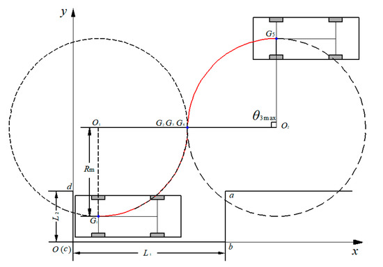 In order to discuss the possible maximum value of angle θ3 i.e., θ3max or the maximum distance between point G7 and point G5, extreme position of parallel parking showing θ3max is illustrated in Figure 12. The value of angle θ3 is related to the position of point G4. If the vehicle parks with the minimum turning radius, regardless of the road width limit, when the length of the straight line segment O1O2 connecting the two arcs is 0 (the two arcs are directly tangent) and the straight line segment O1O2 is parallel to the lane line, the maximum value of angle θ3 can be obtained. At this time, point G2, G3, and G4 coincide to the same point and the maximum value of angle θ3 is 90°.