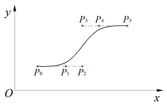 Bézier curve is a smooth and continuous engineering curve, which can describe complex shape and show curve trend through control points. Through analysis, the Bézier curve needs at least six control points to satisfy curvature continuity constraint, that is, at least fifth order. Because the higher the degree of the Bézier curve, the more complex the curve [17], the fifth order Bézier curve shown in Equation (19) is selected to fit the initial planning path of arc-line-arc.