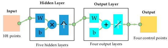 Figure 16 shows the neural network after training, with five hidden layer units. Taking the slope data of the arc-line-arc path shown in Figure 12 as the input of the neural network, the horizontal ordinates values of control points P1, P2, P3, and P4 are 2.6442, 1.1935, 6.8065, and 5.3558, respectively.