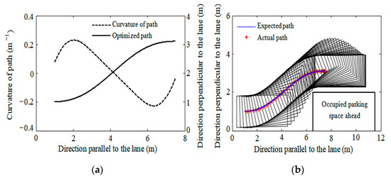 The maximum curvature value of parallel parking path based on Bézier curve |K|max is 0.2284 m−1, which is less than the allowable maximum curvature value 0.2381 m−1. So, the path curvature constraint is met.
