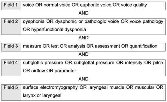 An advanced database search was performed in six electronic databases: Web of Science, Medline, Scopus, Embase, Cochrane Library, and SciELO on 19 December 2019, and last updated on 30 September 2020, without any language or year filters. The search strategy was designed by taking into account previously published studies within the field of the evaluation of voice parameters, and their most cited descriptors. Consequently, the following search terms were used: “voice”, “normal voice”, “euphonic voice”, “voice quality”, “dysphonia”, “dysphonic”, “pathologic voice”, “voice pathology”, “hyperfunctional dysphonia”, “measure”, “test”, “analysis”, “assessment”, “quantification”, “subglottic pressure”, “subglottal pressure”, “intensity”, “pitch”, “airflow”, “parameter”, “surface electromyography”, “laryngeal muscle”, “muscular”, “larynx”, “laryngeal”, “acoustic analysis”, “acoustic measurement of voice”, and “acoustic parameters”. The Boolean operators “AND” and “OR” were used to annex the search terms. The search strategy, divided by search fields, is illustrated in Figure 1.