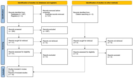 The study selection process is shown in Figure 2. The database searches identified 467 records: seven from Scopus, 66 from Cochrane Library, 178 from Medline, 188 from Web of Science, and 28 from Embase. The search performed in SciELO produced no results. Duplicates were discarded using the reference manager software, resulting in 384 records. From the resulting records, 367 were excluded upon screening of the title and abstract. Two additional eligible studies were found upon screening the references of the resulting studies. The resulting 19 papers were evaluated by full-text screening, and all of them were eligible for qualitative synthesis.