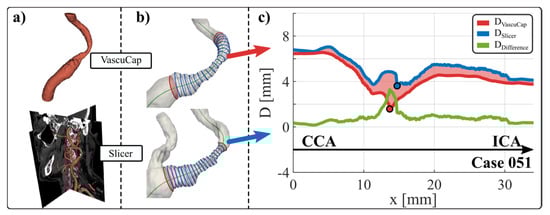 Steps of data preparation. (a) segmentation with both techniques (top VascuCap-semi-automatic segmentation by medical examiner, bottom Slicer—manual segmentation by non-medical examiner), (b) cross-section extraction and (c) diameter difference calculation along the centerline. The diameters are given in mm on the diagram. The dark blue line shows the lumen diameter segmented by Slicer, the dark red line shows the lumen diameter segmented by VascuCap and the green line shows the difference. ICA: internal carotid artery, CCA: common carotid artery.