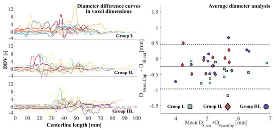 The summary of the evaluation can be seen in Figure 3 for all the cases. In the left panel of Figure 4 only the diameter difference curves are shown, normalized by the voxel dimension (DDV curves). These diagrams collectively show the cases in each group for visual interpretation. By visual inspection an excessive over-segmentation can be seen in the first group by the manual segmentation. In Group II difference curves tend to move closer to the 0 value with some cases of under-segmentation. Visually, the cases of Group III. are similar to those in Group II. with less under-segmentation. In the right panel of Figure 4 a Bland–Altman diagram can be seen to analyze the average diameters obtained from both methods that comprises all three groups. The quantitative results confirm the visual interpretations closely. Furthermore, it shows that the cases in Group II. are less scattered around the overall average than in Group III.
