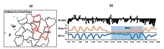 (a) Sampling site at Jangsu-gun, Jeollanamdo. (b) Meteorological conditions during the sampling periods.