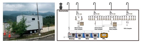 To examine the originations of PM2.5 in agricultural areas, PM2.5 and gaseous pollutants were measured for two weeks from 6 July to 20 July 2020 at an apple orchard located in Jang-Su, Jeollabukdo, Republic of Korea (Figure 1). The collected PM2.5 samples were analyzed for organic carbon (OC), elemental carbon (EC) with the National Institute of Occupational Safety and Health (NIOSH5040) protocol, equivalent black carbon (eBC) from multi-angle absorption photometer (MAAP) (5012, Thermo Scientific, Waltham, MA, USA), water soluble organic carbon (WSOC) from total organic carbon (TOC) (Sievers M9, General Electoric, Boston, MA, USA) analyzer, water-soluble ions from ion chromatography (IC) (Metrohm 930, Herisau, Switzerland), and trace elements from Energy Dispersive X-ray Fluorescence Spectrometry, ED–XRF (ARL QUANT’X EDXRF Spectrometer, Thermo Scientific, Waltham, MA, USA), to investigate the characteristics of PM2.5 in agricultural areas. During the measurement period, gaseous compounds, such as NH3, NO and NO2, were analyzed in real time; and additionally, VOCs were collected using solid adsorption. All instruments were operated in an air monitoring trailer with meteorological monitoring during the sampling periods.
