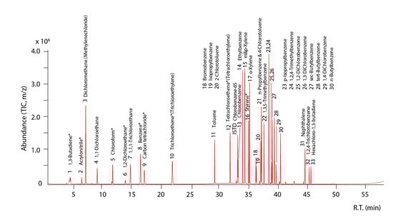 The sequence VOCs sampler was implemented at a flow rate of 50 mL/min to minimize the loss of low VOCs, and automatically collected using an automatic switch that functions every 3 h (Figure 2). VOCs (Custom (Q-QC27-1), Kemidas (M-VAVOC 503M2), Gyeonggi-do, Korea) were used as standard material for analysis. The internal standard material was chlorobenzene-d5 manufactured by Kemidas. solid adsorption tube (C2-CAXX-5149) (Markes International, Ltd., CF31 3RT, UK) was utilized for sample collection and calibration curve. VOCs were analyzed using Thermal Desorption (Unity2, Markes International, Ltd., CF31 3RT, UK) gas chromatography (GC) (7890A, Agilent, Santa Clara, CA, USA) mass spectrometry (MS) (5975C, Agilent, Santa Clara, CA, USA), and the analysis method was US EPA TO-17 (solid adsorption method). There were 33 compounds for analysis that included benzene, toluene, ethylbenzene, and xylene both for agricultural chemical analyses and orchard ambient (Figure 3). The 1 μL of a diluted solution by mixing two standard VOCs in the solid adsorption tube was collected using nitrogen gas at a flow rate of 50 mL/min. In addition, 1 μL of chlorobenzene-d5 at the concentration of 50 mg/L was injected into the adsorption tube and all the samples at a flow rate of 50 mL/min, using nitrogen gas to finalize the calibration curve. After that, the VOCs collected in the solid adsorption tube were desorbed by thermal desorption, inducing low-temperature concentration and resorption at −20 °C, and then thermally desorbed at 320 °C for 15 min, and transferred to the GC. After GC injection, samples were separated by a column of 60 m length, 0.25 mm inner diameter, and 0.25 μm thickness, and were finally quantified by quadruple mass spectrometry.