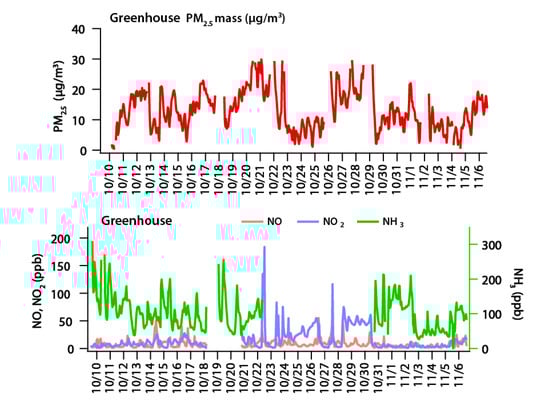Figure 4 shows the results of PM2.5, NO, NO2 and NH3 measured at the Wanju greenhouses. The average concentration of PM2.5 observed during the study period was 12.98 µg/m3, the average concentration of NO was 8.11 ppb, the average concentration of NO2 was 15.11 ppb, and that of NH3 was 101.34 ppb. In addition, the maximum concentration observed during the measurement period of PM2.5 was 29.96 µg/m3, and those of NO, NO2, and NH3 were 55.06, 183.62 and 309.27 ppb, respectively. According to the monthly atmospheric report of Jeonbuk province in October 2020 from the urban atmospheric measurement network data of the monthly atmospheric report, the average concentration of PM2.5 was 17 µg/m3, and the maximum concentration over 24 h was 32 µg/m3, while the average concentration of NO2 was 9 ppb, and the maximum concentration during 24 h was 12 ppb. Comparing the monthly atmospheric report to the measurements of this study, the concentration of PM2.5 was similar, while NO2 was 1.7 times higher than the local concentration on average, and more than 20 times higher at maximum. The concentration of ammonia is not shown in any publication of the same province. When comparing the 6.9 ppb of NH3 concentration in Seoul suggested in the previous study, NH3 in the research area was 14.7 times higher than the average concentration, and 44.8 times higher than the maximum concentration [21]. That means that the above result shows that the concentration of PM2.5 in the greenhouse is similar to or lower than the concentration of the local area, but the precursor gases, such as NO2 and NH3, are higher than the local concentration.