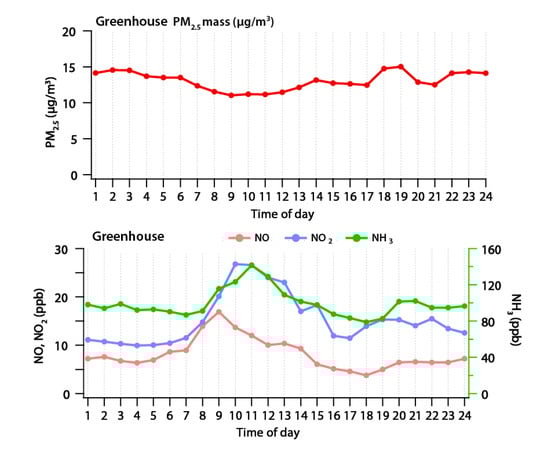 Figure 5 shows the concentrations of PM2.5, NO, NO2 and NH3 measured in the greenhouse over time. PM2.5 had concentration range of 11.03–15.01 µg/m3 with standard deviation of 1.23 µg/m3, which means there was no significant change in concentration over time. On the other hand, NO was in the range 3.76–16.9 ppb, with standard deviation of 3.24 ppb; NO2 was in the range 9.93–26.77 ppb, with standard deviation of 5.22 ppb; and NH3 was in the range 78.77–141.54 ppb, with standard deviation of 15.01 ppb, which means that the variation was higher than the variation of PM2.5. When looking at the concentrations of NO and NO2 over time, the concentrations of NO and NO2, which were relatively stable at night and dawn, increased after 7 a.m., and NO showed the maximum concentration at 9 a.m., and then decreased. On the other hand, the maximum concentration of NO2 was observed between 10 and 11 a.m., which was about 1 to 2 h later than the time when the maximum concentration of NO was observed. This is interpreted as NO changing into NO2 by typical photochemical reaction. The change of NH3 concentration overtime was relatively constant at dawn and nighttime, like NO and NO2; and after 8 a.m., the NH3 concentration started to rise, and showed the maximum concentration at 11 a.m. After that, it gradually decreased until 5 p.m., and then remained relatively constant. It is difficult to understand the characteristics of the primary emission source, because fertilizer, crop and soil characteristics, crop management, and meteorological conditions have multiple impacts on the emission of NH3 in the agricultural environment [15,16,17,18]. NH3 in the greenhouse can be evaporated by temperature rise based on the time when the NH3 concentration increases and reaches the maximum during the daytime. As a result of measuring the level of PM2.5 and precursor gases for 28 days in the greenhouse, which is a relatively closed system, agricultural activity did not significantly affect the increase in PM2.5. However, an increase in precursors, such as NO, NO2 and NH3, was observed from agricultural activities; and it was found that each material increase was based on temperature and photoreaction.