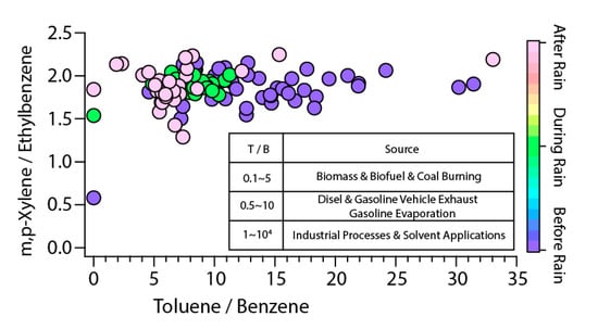 The T/B of this study ranged from 1.89 to 33.05, with an average of 10.05, and 101 out of 106 observed T/B showed 4.0 or higher. T/B is used as data for estimating emission sources. Generally, biomass combustion has T/B of 1 or less, 0.1–5 for coal combustion, 0.5–10 for combustion by vehicles such as gasoline and diesel, and 1 or more for emissions from industrial processes and solvents, which in previous studies showed up to 10,000 [69]. The mean value of T/B in this study is 10.05, and as Figure 6 shows, a ratio of 10 or higher represents more than 40% of the entire observed values. In addition, the research area is the center of the orchard, and there is no industrial area within a radius of 1 km of the observation point. In other words, considering the observed value of T/B in the study area and the surrounding environment, the source of VOCs in the study area is assumed to be solvents, and that seems to be due to the agricultural chemicals used in the orchard area.