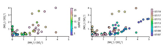Ions cross-plots for the molar ratio of NH4+/SO42− vs. NO3−/SO42−.
