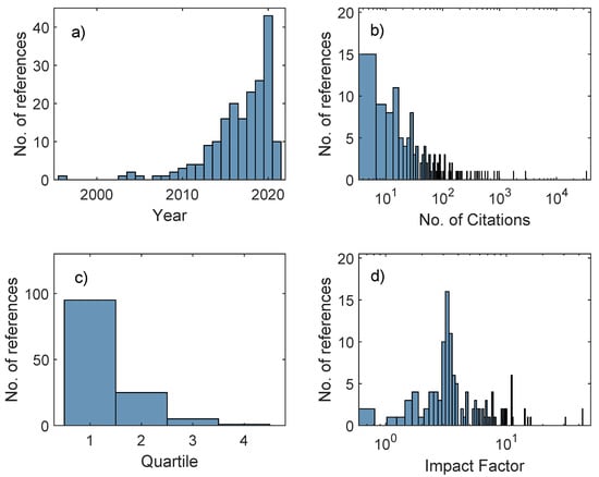 Figure 1. Histograms showing the distributions of different features of the papers selected for this review: (a) Year, (b) Number of citations, (c) Journal Quartile and (d) Journal Impact Factor. - Among the selected literature for each section, the most cited papers, including journal articles and conference proceedings were revised extensively. Figure 1b presents the distribution of the number of references with an increasing number of citations of the revised literature. Papers from Q1 and Q2 journals were given priority over Q3 and Q4 journals; as well as journals with impact factors higher than 1.0. Figure 1 shows (c) the quartiles, and (d) journal impact factor of the revised papers in this this review. Additionally, Figure 2a shows the type of references (journal, conference proceedings, books, webpages, and theses) selected and its percentage;