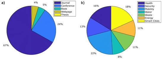 Figure 2. Pie charts representing the distribution of the (a) Type of reference and (b) Topic of the selected references for this review. - In the six main sectors, preference was given to articles where the main topic was the use of sensors exclusively for the subject evaluated. A wide range of studies from the exploration of theoretical aspects up to practical applications were included. Figure 2b shows the percentage of revised papers under categories “Health”, “Security”, “Mobility”, “Water”, “Waste”, “Energy”, and “Smart Cities”;