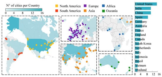 Map of smart cities across the world. The shade of color represents different number of smart cities per country. Cities are represented with colored points in the map, identified in six main regions: Africa, Asia, Europe, North America, Oceania, and South America. The bars on the right side show the countries with highest number of smart cities.