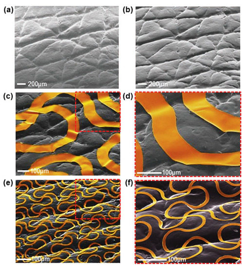 (a) Epidermal electronic system (EES) made of a skin replica created from the forearm, before and; (b) after application of a spray-on-bandage; (c) Colourized microscopy image of the EES with conductive gold films of 100 m and; (e) its magnified view. (d) Microscopy image of EES with gold films of 10 m and; (f) its magnified view [48].