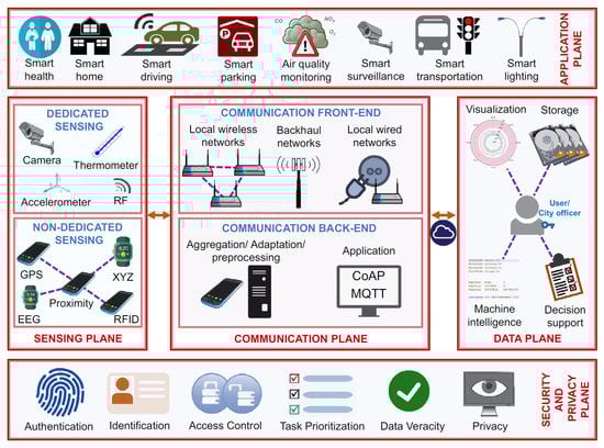 Smart city architecture defined in five planes: application (connects city and citizens), sensing (sensors measurements), communication (cloud services), data (processing and analysis) and security and privacy planes (assurance of security and privacy) [85].