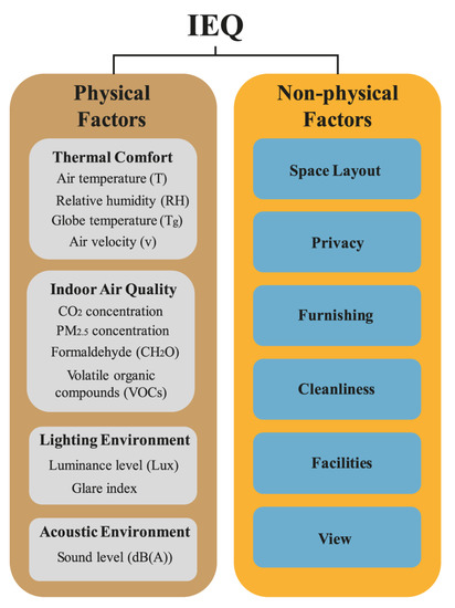 Buildings represent 40% of total energy consumption [134] and 30% of greenhouse gas (GHG) emissions [129,134]. The main physical and non-physical factors involved in indoor environment quality are shown in Figure 9 [134]. These factors are measured using wireless sensors [135,136], virtual sensors [137], and artificial neural networks [16]. Energy consumption in buildings is associated mainly with (i) thermal comfort (operation of heating, ventilation, and air conditioning-HVAC systems); (ii) indoor lighting; (iii) various electrical loads (operation of electric equipment); (iv) thermal loads (use of fuels for heating and cooking), and (v) indoor air quality (pollutant concentration, odor, and noise) [138,139]. Table 2 shows the variables used to grade these five aspects and the sensors frequently used to measure these variables. However, additional variables influence energy consumption, such as the occupation level [140], and the building’s structural design [141], and outdoor conditions (temperature, humidity, pressure, and solar radiation). Therefore, additional sensors are used to measure them. Some research works have focused on designing intelligent building management systems (BMS) that use, in real-time, data from the sensors listed above and take actions oriented toward the reduction in energy consumption, such as turn lights off, closing doors and windows, etc. [142].
