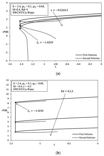 Variation of −θ′(0) versus for SWCNT/Cu–water with different values of: (a) ε when S = 2.4, = 0.1, = 0.04, M = 0.4, Gr = 0, and Rd = 3; (b) Rd when S = 2.4, = 0.1, = 0.04, M = 0.4 and ε = −0.5.