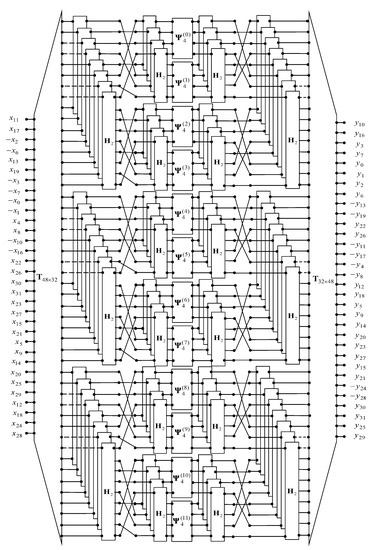 We first rearrange the rows and columns of the matrix respectively using the permutations: = (11, 17, 2, 6, 13, 19, 3, 7, 0, 1, 4, 8, 10, 16, 22, 26, 30, 31, 23, 27, 15, 21, 5, 9, 14, 20, 25, 29, 12, 18, 24, 28) and = (10, 16, 3, 7, 0, 1, 2, 6, 13, 19, 22, 26, 11, 17, 4, 8, 12, 18, 5, 9, 14, 20, 23, 27, 15, 21, 24, 28, 30, 31, 25, 29). Next, we change the sign of the selected rows and columns by multiplying them by −1. We can easily see that this transformation leads in the future to minimizing the computational complexity of the final algorithm. Then we can write: