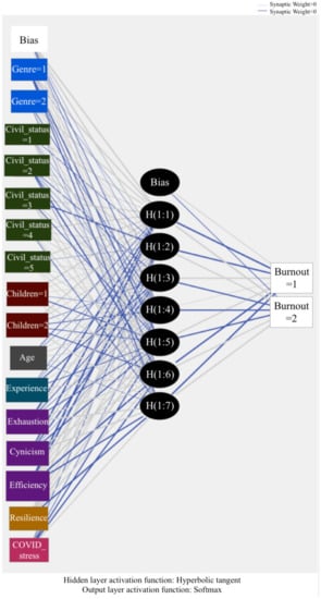 At this stage, it is necessary to respond to the hypotheses that were initially raised in this study. Thus, H1, “if moderate levels of burnout were expected to be found”, is confirmed. It was observed that a medium-high percentage of the participant population suffered from this syndrome, presenting a high level in the emotional exhaustion and cynicism dimensions versus a low level for the professional efficacy dimension. In this sense, taking into account that requirements were met to confirm the presence of burnout syndrome, i.e., that the burnout and cynicism dimensions were high and professional efficacy was low, authors such as [] showed that, on the burnout scale, the teaching staff obtained a moderate level for this syndrome. Likewise, studies by [] observed that, of the participants in their sample, a medium percentage of the population suffered from burnout syndrome, in line with the hypothesis proposed here. With respect to the ANN designed, it was able to correctly locate 97.4% of the cases, differentiating between those who suffered from burnout syndrome and those who did not. The use of this type of network to predict psychoeducational variables and even stress has recently been successfully applied in the university setting [].