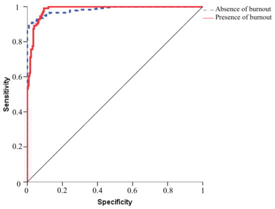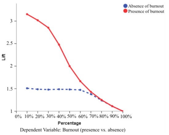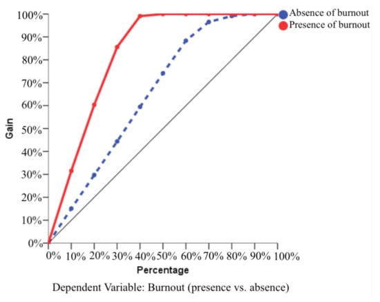 To evaluate ANN performance, ROC curves were used. The area under the curve was 0.983 for both the presence and absence of burnout. This is consistent with the high predictive ability found. The closer the area is to 1, the better the fit of the model to reality. These curves measure the productive capacity of the network or of discriminating cases. Therefore, they are an instrument to assess performance. To evaluate the network by visual analysis, Figure 2, Figure 3 and Figure 4 are shown. Figure 2 analyzed the relationship between sensitivity and specificity. The diagonal line represents the probability of getting it right in a 50% chance scenario. It can be seen how in the case of both the presence of burnout and in the curve representing the absence of burnout, the lines are to the left of the diagonal, far away from it. These results reflect a high sensitivity of the artificial neural network, detached from mere chance. It can be seen how there are two curves in Figure 2, so that for each of them the specificity and, therefore, the discrimination and sensibility capacity of the network is being shown, becoming practically similar in cases of both presence and absence of burnout. Figure 3 represents the gain with the lines above the diagonal as they are. The graph is a representation of a cumulative gain, and the diagonal is the baseline so that the cases above it represent the cases placed in their category for each situation (presence versus absence). For example, the top 20% of cases contains 60% of the cases with presence of burnout. Finally, Figure 4 refers to the lift. It is possible to observe how the presence and absence of burnout converge to values close to 100%. This figure comes from accumulated earnings and allows us to see the same data in a different perspective.