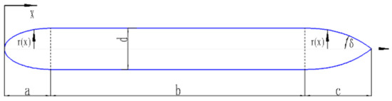Here, represents the body diameter, represents the head length, can be used to determine the shape of the head section, represents the length of the stern section, and represents the tail wrap angle, which determines the shape of the stern. The greater the angle of , the smoother is the shape change at the stern. The parameters of the MYRING hull profile equations in this study were as follows: = 280 mm, = 1530 mm, = 400 mm, = 260 mm, = 2, and = 0.8.