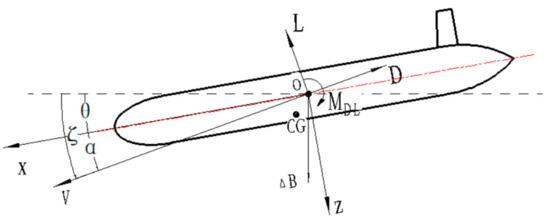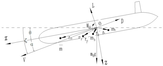 Here, and represent the horizontal and vertical displacements of the UG in the Earth reference coordinate frame, respectively; is the AOA; is the angle of pitch; is the gliding angle; and present the velocity components of the glider along the x- and z-axes in the body-fixed frame, respectively; represents the pitch angular velocity of the UG rotating about the y-axis of the body-fixed frame; L is the hydrodynamic lift; D is the hydrodynamic drag; represents the pitching moment yielded by the hydrodynamic; and represent the added mass along the x- and z-axes, respectively; represents the moment of inertia rotating about the y-axis; and ,, and , represent the momenta of the movable masses and piston along the x- and z-axes, respectively.