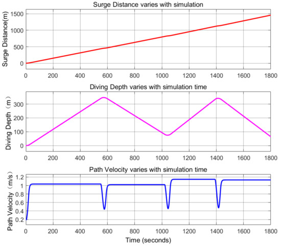 Figure 8 presents the surge, diving, and path velocity varying with the simulation time when the UG glided upward or downward. The horizontal coordinate of the figure indicates the simulation time, and two motion cycles were observed, i.e., diving followed by surfacing.