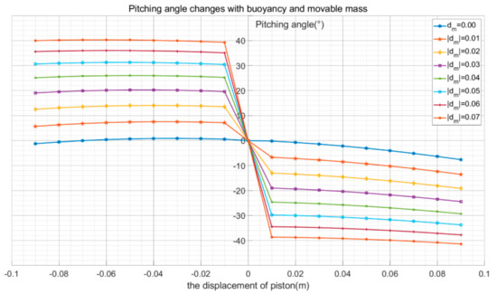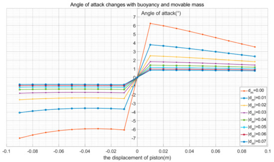 Figure 11). The AOA changed with the buoyancy and movable mass when the UG glided downward and upward. The horizontal coordinate in the figure indicates the displacement of the piston, i.e., the positive and negative regions represent the piston drawing inward and draining outward, respectively. The legend of the figure shows the displacement of the movable mass. The left-half plane indicates that the glider glides upward and the movable mass moves backward, whereas the right-half plane indicates that the glider dives downward and the movable mass moves forward.