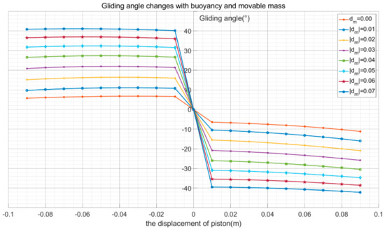 Figure 13 presents the change in the gliding angle with the buoyancy and movable mass when the UG glides upward or downward. The horizontal coordinate of the figure indicates the displacement of the piston, i.e., the positive and negative regions represent the piston drawing inward and draining outward, respectively. The legend of the figure shows the displacement of the movable slider. The left-half plane indicates that the glider glides upward and the movable mass moves backward, whereas the right-half plane indicates that the glider dives downward and the movable mass moves forward.