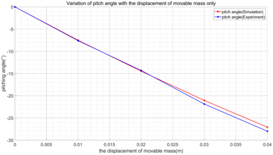 First, the glider was suspended horizontally in water by the buoyancy adjustment mechanism and the movable mass block; at the end of the experiment, the distance from the surface of the piston to the end face of the buoyancy cylinder in the buoyancy engine was measured so that the mass of ballast water in the buoyancy engine for this experiment could be calculated; subsequently, the buoyancy mechanism was maintained, and the experimental values of the pitch angle under different attitudes were obtained by adjusting the different positions of the movable mass block, in which the movable mass block moved 10 mm each time. During the motion of the movable mass, the pitch angle was recorded at each moment using the built-in sensor on board, and after the experiment, the data were exported and fitted to produce a relationship between the pitch angle and the displacement of the movable mass. Next, the experimental results were compared with the simulation results. Owing to the limitations of the experiment, only the comparative results of the forward motion of the movable mass block are shown herein. The comparison results showed that the simulation and experimental results agreed well, with a maximum error of less than 1°. By comparing the model with the physical glider, the analysis concluded that this error should be caused by the distribution of the cables inside the fuselage. We can only measure the mass and the approximate location distribution of the cables, but we cannot easily reproduce the distribution of the cables inside the fuselage with the modeling software. More detailed results will be described in a future paper. The comparative results of the experimental and simulation results are shown below