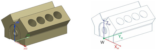 The workpiece offset defines the position and orientation of the workpiece in the deburring cell. In our case, an engine block is used as the workpiece and is presented with the XM-YM-ZM frame (Figure 5). The translation vector represents the position of the workpiece offset and the Euler angles represent the orientation of the workpiece offset relative to the rotating clamping plate frame . By default, the workpiece offset matrix is identical to .