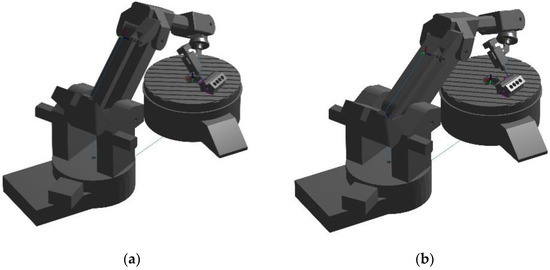 The kinematic model of the one DOF rotary table is assembled from the following two components: the fixed table base and the rotary clamping plate (Figure 4). The translation vector represents the position of the table base relative to the robot base . The translation vector represents the position of the rotating clamping plate frame relative to the table base frame and forms the final homogeneous transformation matrix . The rotation of the rotary table is limited to the interval