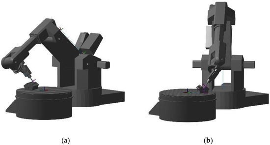 When deburring the edges of the first cylinder bore, the maximum rotational difference of the table is 0.05°. One reason for the small rotational difference is that only every tenth toolpath segment was considered in the optimization. If the complete toolpath was considered, each additional segment would also contribute to the maximum rotation difference. Second, the absolute maximum table rotation was evaluated for a worst-case scenario. If the Euclidean distance, based on which the absolute maximum table rotation was calculated, were to take the current toolpath segment into account, a larger maximum table rotation difference could also be achieved. Between the deburring of each edge and each cylinder bore, non-cutting motions occur. During the non-cutting motions, free table rotation is enabled. The table rotation during deburring of the first and the fourth cylinder bore on the left side of the engine block was 5.07°. Despite the possibility of a larger table rotation, only a small rotation is performed to reposition the workpiece to the area with the highest stiffness of the robot, which shows that the workpiece placement found by the optimization algorithm is robust. Figure 10 shows the posture of the robot and the rotation of the table when deburring the first cylinder bore on the left and when deburring the fourth cylinder bore on the right.