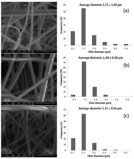 SEM images and fiber diameter distributions of the electrospun nonwoven fabrics obtained from (a) PLA, (b) 3HPO/PLA and (c) 5HPO/PLA (×10,000) (average ± standard deviation).