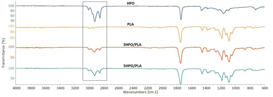 The functional groups of HPO, PLA, and HPO/PLA electrospun nonwoven fabrics were determined by ATR-FTIR spectroscopy (Figure 2).