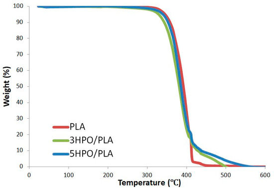 Weight loss as a function of temperature due to degradation is measured by thermogravimetric analysis (TGA). In the TGA curves, the onset temperature, where the deterioration process began, and the end temperature, where the combustion process ended, were both evaluated. The TGA profiles of PLA and HPO/PLA electrospun nonwoven fabrics are shown in Figure 3. Thermal degradation of PLA occurs in a single weight loss phase, as evidenced by the TGA curves. PLA has higher onset degradation temperatures than PLA/HPO blends. The profile for PLA degradation peak was at ~368 °C [79] and it was completely decomposed at ~444 °C, associated with the loss of ester groups by unzipping depolymerization [80]. On the other hand, the HPO/PLA samples of both the 3HPO/PLA and the 5HPO/PLA electrospun nonwoven fabrics showed nearly two steps of degradation, as shown in Figure 4. These degradations occurred at temperatures ranging from ~360–354 °C to ~500–550 °C, respectively.