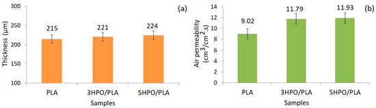 Figure 4 shows the thickness and air permeability test results of PLA and HPO/PLA electrospun nonwoven fabrics. Thickness is an essential characteristic of textile materials since it has a direct influence on performance attributes such as permeability. The thicknesses of the PLA, 3HPO/PLA, and 5HPO/PLA electrospun nonwoven fabrics were measured as 215 ± 12 μm, 221 ± 8 μm, and 224 ± 6 μm, respectively. The volume of the electrospinning solutions was used to regulate the thickness. Although all electrospun nonwoven fabrics were made in the same way, the slightly higher thickness value of the HPO/PLA blended fabrics can be attributed to the existence of lower surface tension that reduces resistance to applied electric force, causing fibers to accumulate in a narrower area on the collector. Thus, the presence of HPO into PLA electrospinning solution increased nonwoven mat thickness.