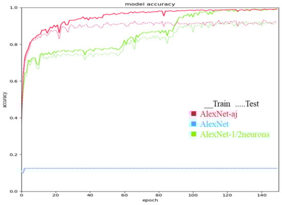 In order to prove that the adjusted number of neurons is appropriate and will not affect the learning ability, the regular AlexNet, AlexNet-1/2neurons and AlexNet-aj are tested respectively. Figure 2 shows that after 150 epochs, the training curves of each model have reached convergence. Since the sample size of coffee beans is only 112 × 112, the number of neurons in regular AlexNet is too large to learn features effectively. After reducing the number of neurons to 1/2, the accuracy can be greatly improved. However, two sharp increases occur during the convergence process. This is due to a large number of neurons, which makes the weights easy to fall in an interval during the optimization process and fail to converge. In contrast, the number of neurons in the AlexNet-aj convolutional layer is about 1/3 of that of AlexNet. The number of neurons in the fully connected layer is also reduced to 1/4 of AlexNet to speed up convergence. As a result, AlexNet-aj responded quickly at the beginning of training and reached convergence in about 30 epochs. This proves that the number of neurons used in this study is appropriate for the training of coffee beans samples.