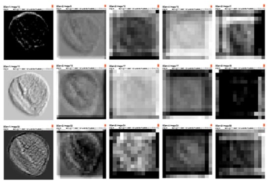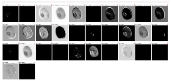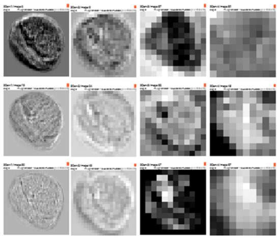 Indicators such as accuracy, precision, and recall rate are used to evaluate the generalization of a trained model. During CNN construction, the generalization of each network layer must be evaluated. After the training was completed in this study, convolution visualization was performed to obtain individual images of feature extraction results after passing the input image through all the neurons generated in each network layer. Finally, an evaluation was performed to determine whether the neurons generated through weight optimization successfully extracted features from the input image (Figure 3).