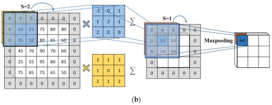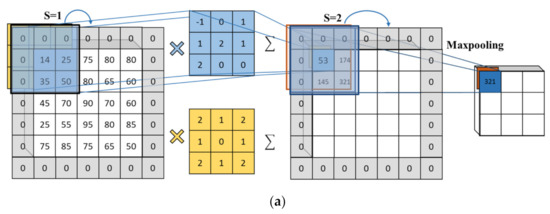 In CNN, pooling layers are commonly used to reduce the dimensionality of an input image. The most common pooling layers are the max pooling and average pooling layers. Figure 5a illustrates the operating principles of these layers. The convolution kernel first extracts the features with a single stride, and then the maximum pooling layer enhances images and reduces the dimensionality of images with double strides. Image enhancement and dimensionality reduction are simultaneously performed in the pooling layers. However, when using this strategy, because the dimensionality reduction process does not involve weight multiplication, features are easily lost.
