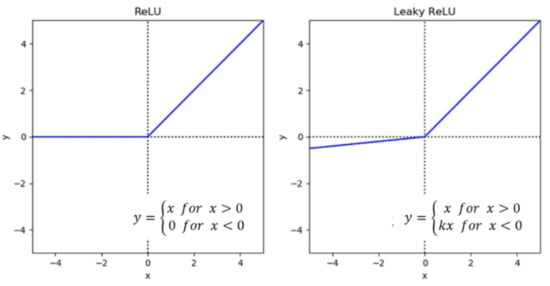 To resolve the dead ReLU problem, He [25] proposed a variation of the ReLU by introducing a leaky value in the negative value range of the function (Figure 7). When inputting a negative value into the leaky ReLU, the output value no longer becomes 0; thus, the generation of a dead neuron is prevented. Multiple studies have verified that the leaky ReLU improves model accuracy [26] and increases network complexity without exerting negative effects on learning efficiency [27,28].