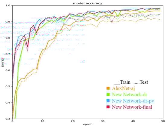 Table 6 presents the performance of the three constructed models. The experimental results show that the params of the New-network-dr model are three times that of Alexnet-aj, and the FLOPs increase by about 80%. The training time only increased by about 40%, and the model test accuracy increased by 4.2%. This shows that the proposed dimensionality reduction convolutional network greatly increases FLOPs and greatly improves the training accuracy. New-network-final has one less convolutional layer than Alexnet-aj. The FLOPs and training time of the two models are not much different, and the test accuracy was greatly improved from 90.2% to 95.1%. It shows that the model proposed in this study has a higher feature extraction ability under a similar amount of calculation.