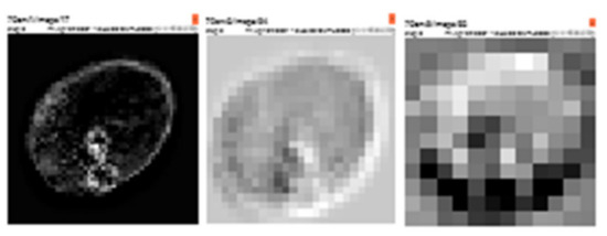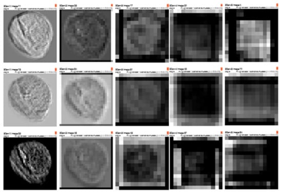 Compared with the images generated by the ReLU, those generated by the leaky ReLU exhibited less contrast and thus less visible features (Figure 14). However, the dead neurons generated by the ReLU constituted 30% of all the generated neurons, which were fully output through the leaky ReLU. The bottom image in the third column of Figure 14, which was obtained from Convolutional Layer 3, indicates that the neurons retained by the leaky ReLU contained image features that were not displayed in the images generated by the ReLU. This result verified that the ReLU generated an excessive number of dead neurons and obstructed the propagation of image feature data.