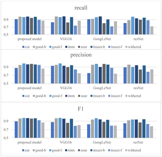 The model proposed in this study can have generalized recognition ability in multi-category flaw recognition. In order to prove the excellent recognition ability of the model, a comparison in the recall, precision and F1 of the common models and the proposed model for each category is conducted (Figure 17). The difference between the models in the recall is the most obvious. VGG16, GoogLeNet and resNet models have obvious deviations in the recognition ability of different categories, and the proposed models have very small recall deviations in each category. It is proved that the recognition ability of the proposed model was steadily improved in each category, and it has an excellent performance in multi-category defect recognition.