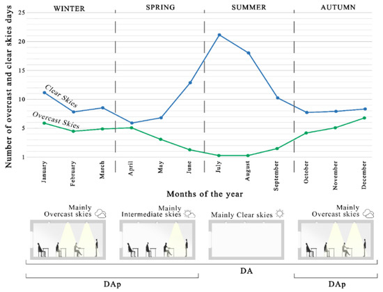As a result, it can be stated that the real autonomy of daylight for seasonal use spaces with summer vacations is lower than that obtained by the classical metric of DA, especially when there is a poorer access to daylight. Thus, the access to daylight determines the divergence between DA and DAp. The limited access to natural light in an indoor space depends on a combination of two or more architectural parameters, such as the predominance of overcast skies, windows facing a northern orientation, or small openings, as well as, although to a lesser extent, the reflectance of the inner surfaces.