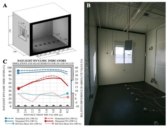 (A) Size of the test cell and distribution of illuminance-meters—(B) Inner view of the test cell—(C) DA results calculated both from illuminance measurements and simulations, including Relative Difference (RD) between them.