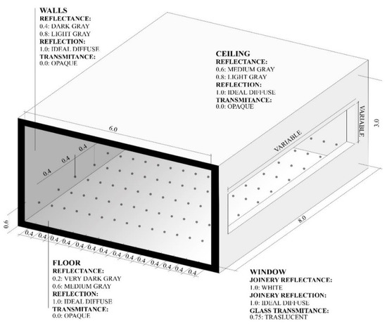 With the aim to quantify the divergence of DA and DAp under different scenarios and subsequently to the validation process, a simulation procedure is carried out. A virtual venue measuring 6.00 m wide, 8.00 m in length, and 3.0 m high, corresponding with the typical dimensions for a Spanish classroom, was defined according to regional standards [] and to a characterization of existing educational buildings [] to analyze both dynamic metrics. A window of variable size (window-to-wall ratio (WWR) of 30%, 45%, and 60%) is located in one of the facades. The window glazing has an optical transmittance of 0.75. The inner surfaces of the studied model act as diffuse reflectors, following the Lambertian distribution, where the luminous intensity of the reflected light is proportional to the cosine of the angle between the observer’s line of sight and the surface normal. Two average reflectance sets are addressed in the calculation process, considering bright surfaces with high reflectance values and dark surfaces corresponding to low reflectance values. The parameters related with the calculation model are described in Figure 3.
